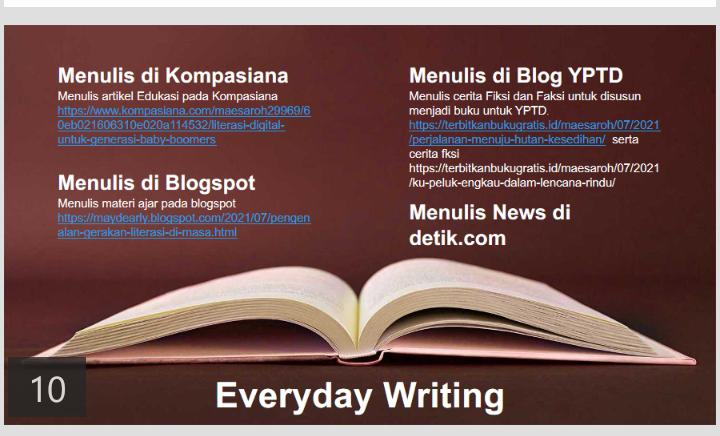 • Selama duduk 10 menit tersebut saya selalu merangkai paragraf pembuka yang selalu dikemas dengan bahasa yang puitis. Serta menulis paragraf penutup dengan menyisipkan kalimat2 motivasi.