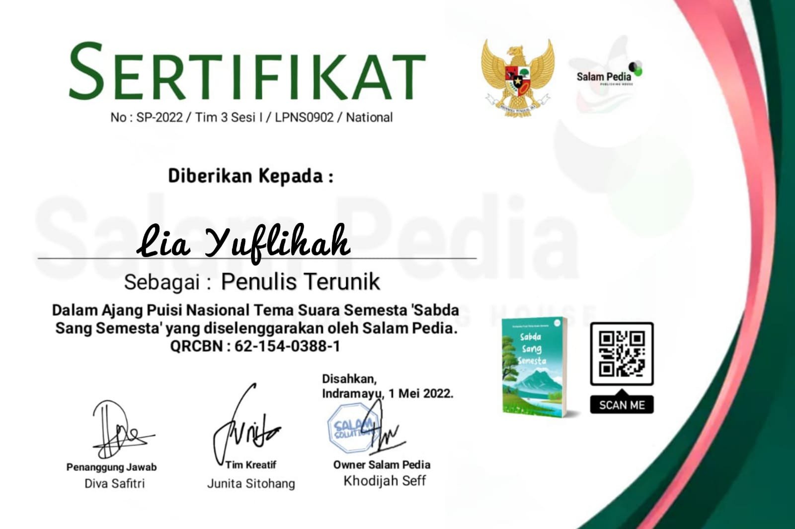 Ini sertifikat event cipta puisi kesepuluh yang saya ikuti, pelaksanaan eventnya saya lupa karena sudah lama. Buku hasil karya peserta event sudah buka PO sejak menjelang lebaran kemarin, namun e-sertifikatnya baru dibagikan satu minggu yang lalu oleh panitia.