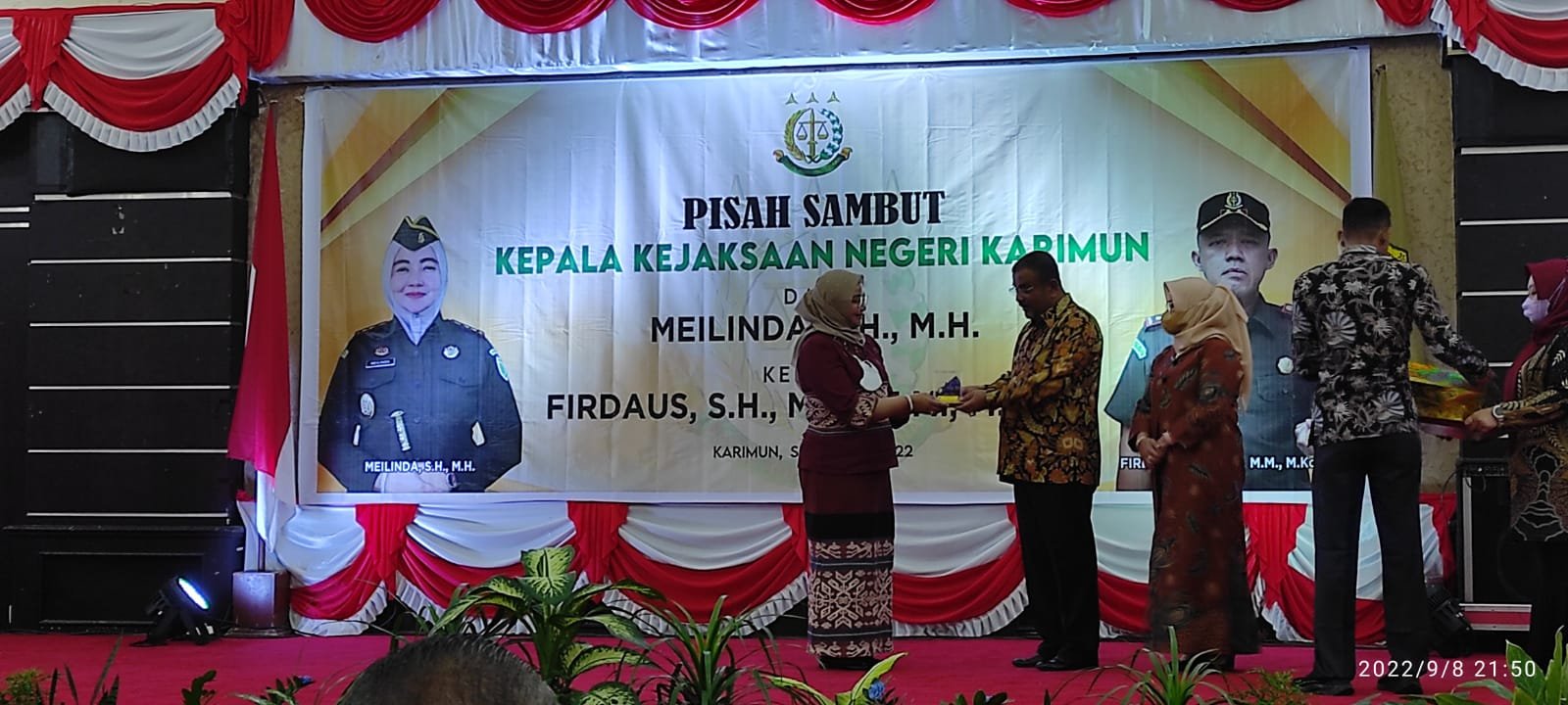 Saya katakan, meskipun sudah beberapa hari yang lalu catatan ini dibuat saya menganggap tetap perlu saya berbagi apa yang dialami. Inilah catatan tentang acara pisah-sambut Kepala Kejaksaan Negeri (Kajari) Kabupaten Karimun yang sudah berganti. Satu pergi, satunya hadir sebagai pengganti. Pisah sambut itu, adalah antara Ibu Melinda, SH MH dengan Bapak Firdaus SH MH MM M Kom sebagai Kajari baru. Bu Melinda akan beranjak ke Ibu Kota Provinsi Riau, Pekanbaru sebagai jabatan promosi sementara Pak Firdaus tadinya mengabdi di Provinsi Tanah Rencong, Aceh. Acara pisah-sambut sendiri dilaksanakan pada Kamis (08/09/2022) malam di Gedung Nasional, Karimun.