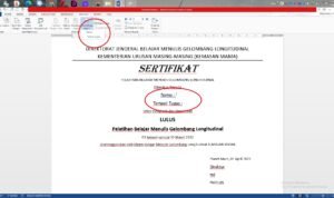 Langkah terakhir proses Mailling adalah memasukkan data peserta ke area yang dikosongkan pada file sertifikat. Tempatkan kursor setelah “nama” lalu klik “insert merger” dan pilih nama. Hal yang sama dilakukan pada “Tempat Tugas” lalu klik “insert merger” dan klik “Tempat Tugas”.