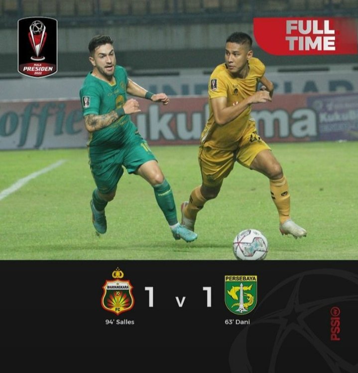 Persebaya Surabaya hanya bisa bermain imbang 1-1 dengan Bhayangkara FC dalam laga di grup C Piala Presiden 2022 yang berlangsung di Stadion Gelora Bandung Lautan Api (GBLA), Bandung pada hari Senin (13/06/2022) malam WIB.