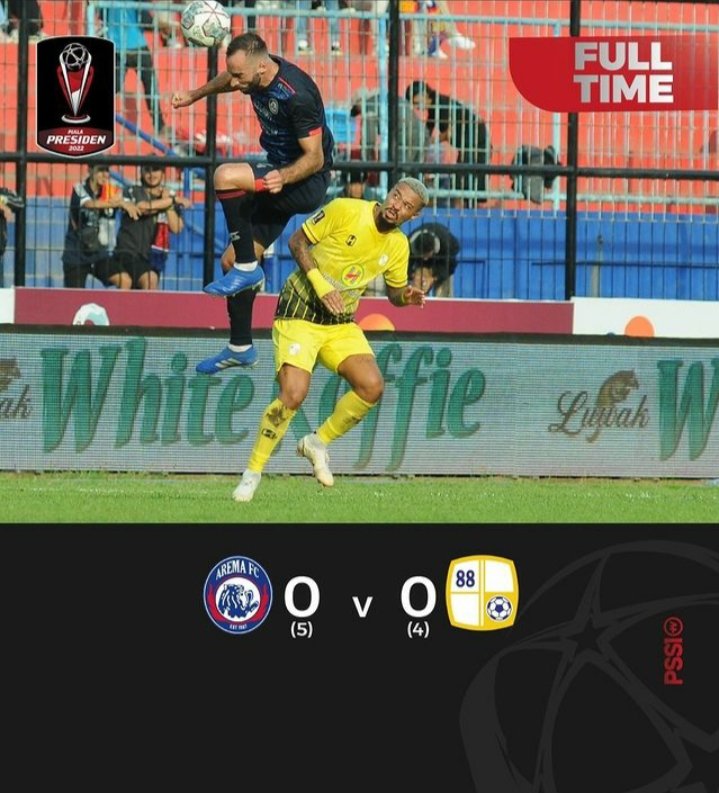Laga kemudian berlanjut ke babak adu penalti. Pada 5 penendang pertama, skor juga masih imbang 4-4. Barulah di 5 penendang berikutnya, Arema FC unggul 5-4.