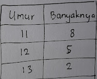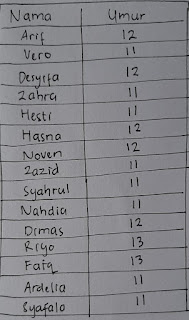 Selanjutnya saya menyilakan anak-anak menyebutkan nama masing-masing disertai umur. Tujuan saya adalah untuk mendapatkan contoh data sebagai bahan pembelajaran hari ini. Data yang digunakan data yang berhubungan langsung dengan anak-anak untuk menarik perhatian mereka dalam belajar. Untuk memulai sekaligus memberi contoh saya pun menyebutkan nama serta umur saya. “Pono 42 tahun”.