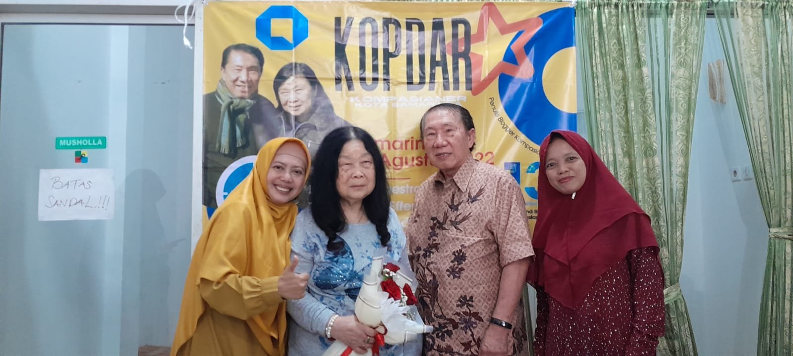 Spanduk dengan foto kami berdua sudah siap dibuat ananda Sigit Eka Pribadi .maka kami berfoto didepan spanduk .Acara ditutup dengan pembagian buku kenang2an, karya tulis dari Suami.Setiap peserta boleh mengambil senamyak dia inginkan dan sisanya kami sumbangkan untuk perpustakaan yang di Samarinda melalui Arya Amirah.