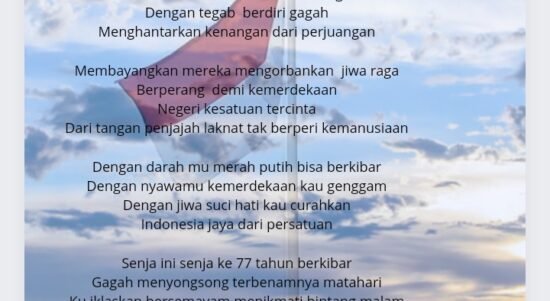 Merah Putih di Ujung Senja Tung Widut Berkibar merah putih di langit biru Dihormati berlaksa barisan berseragam Dengan tegab berdiri gagah Menghantarkan kenangan dari perjuangan Membayangkan mereka mengorbankan jiwa raga Selengkapnya