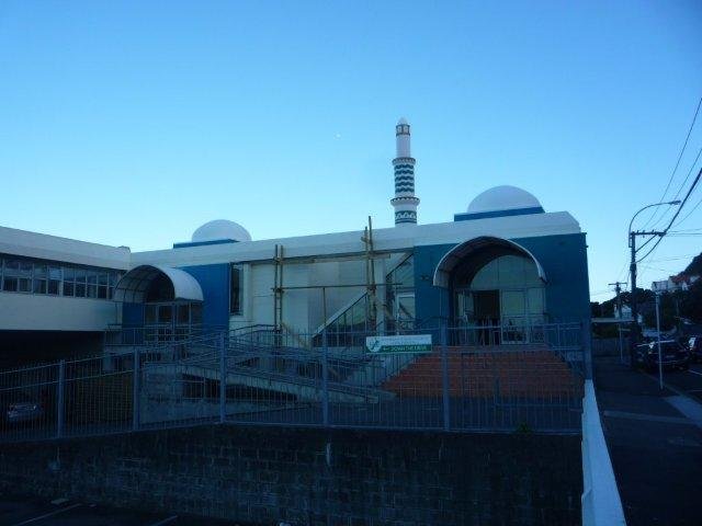 Dari kejauhan, tepat di belakang sebuah pompa bensin, sudah kelihatan sebuah masjid dengan menaranya yang berwarna putih dan biru. Tampak juga kelihatan dua buah kubah kecil yang berwarna putih. Saya berjalan perlahan menuju pintu masuk. Di pagarnya yang dicat berwarna biru muda terdapat angka 7-11 yang menunjukkan alamat kompleks ini di Queens Drive no 7 sd 11. Alias mengambil tiga buah kapling tanah. Di pagar ini juga tergantung sebuah papan petunjuk arah “Federation of Islamic Association of New Zealand atau FIANZ demikian tertulis di papan berwarna hijau putih itu.
