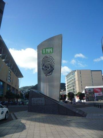 Sesampai nya di halamannya yang luas, sebuah tugu berbentuk bilah menyambut saya. Tertulis dalam warna putih berdasar hijau dengan besar “Te Papa”. Sementara di bawahnya tertulis terjemahannya dalam Bahasa Inggris yaitu “Our Place”. Di halaman yang luas ini juga dengan gagah berkibar beberapa buah bendera kebangsaan New Zealand yang berwarna biru dengan Union Jack kecil di sudut kiri atas dan empat buah bintang berwarna merah putih menghiasi bendera ini. Sementara bangunan klasik Circa Theater juga berada di sekitar Bangunan megah ini, seakan-akan ikut menghiasi halaman museum ini dengan manisnya.
