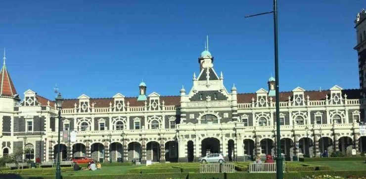 Perjalanan dilanjut dengan berkunjung tempat paling menarik di Dunedin yaitu Dunedin Railway Station atau stasiun kereta api Dunedin. Bangunan stasiun ini ternyata sangat cantik dengan model yang lebih mirip sebuah istana atau kastil dibandingkan sebuah stasiun kereta api. Agak sulit bagi saya untuk menjabarkan keindahan bangunan ini dari luar. Bahkan pada awalnya saya juga tidak tahu gaya arsitektur apa yang digunakan pada bangunan stasiun ini.