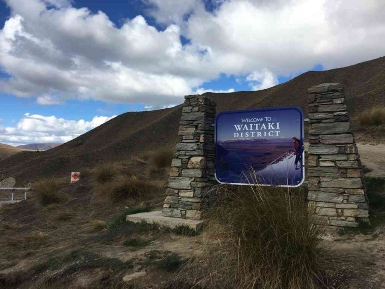 Ada sebuah papan nama bertuliskan ‘’Welcome to Waitaki District,” yang menandakan bahwa kita sudah berada di perbatasan Canterbury dan Otago karena Distrik ini memang terletak di kedua wilayah tersebut. Yang unik adalah gambar yang ada pada papan ucapan selamat datang itu. Gambar pegunungan dengan di puncaknya yang bersalju dan seorang gadis sedang bermain ski sementara di bagian bawah terhampar padang rumput berwarna kecokelatan Tussock Grassland.