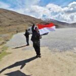 Sambil menikmati pemandangan, saya mengeluarkan bendera sang saka merah putih yang sudah disiapkan dan dengan bantuan angin yang bertiup kencang, akhirnya saya bisa mengibarkan merah putih walau hanya dengan sepasang lengan. Wah senang dan bangganya mengibarkan bendera di sini. Sementara suasana juga sepi dan hanya ada beberapa orang saja yang kebetulan sedang parkir dan menikmati pemandangan sambil memperhatikan kegiatan kami mengibarkan bendera.