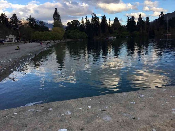 Saya berjalan di tepian danau sambil memperhatikan airnya yang biru, bersih dan tenang. Bayang-bayang pepohonan tampak di permukaan danau dan pegunungan yang puncakmu ditutupi salju kelihatan begitu indah menjadi latar belakang panorama senja di Queenstown. Puluhan atau mungkin ratusan burung -burung berwarna putih beterbangan di tepian danau, bahkan sebagian melewati batas pagar ke pedestrian. Sementara kumpulan bebek warna hitam juga bermain sambil berenang di permukaan danau.