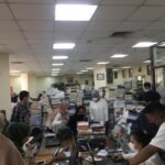 Yang menarik adalah banyak juga penerbit lain yang sedang melakukan kegiatan yang sama dan bahkan ada ribuan judul buku yang masih sementara menumpuk di ruangan ini sambil menunggu disimpan di tempatnya sesuai dengan tema buku.  Buku itu tampak menggunung di tengah ruangan seperti di toko buku yang sedang mengadakan promosi sale besar-besaran.