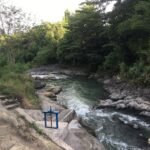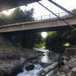 Kebetulan suasana senja itu tidak ramai, hanya ada beberapa sepeda motor yang parkir, dan beberapa orang yang duduk-duku di tepian tebing sungai. Sementara di atas bebatuan besar yang ada di tengah sungai, juga ada seorang perempuan yang sedang bersantai. Bisa membaca buku atau bahkan sambil mendengarkan musik.