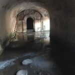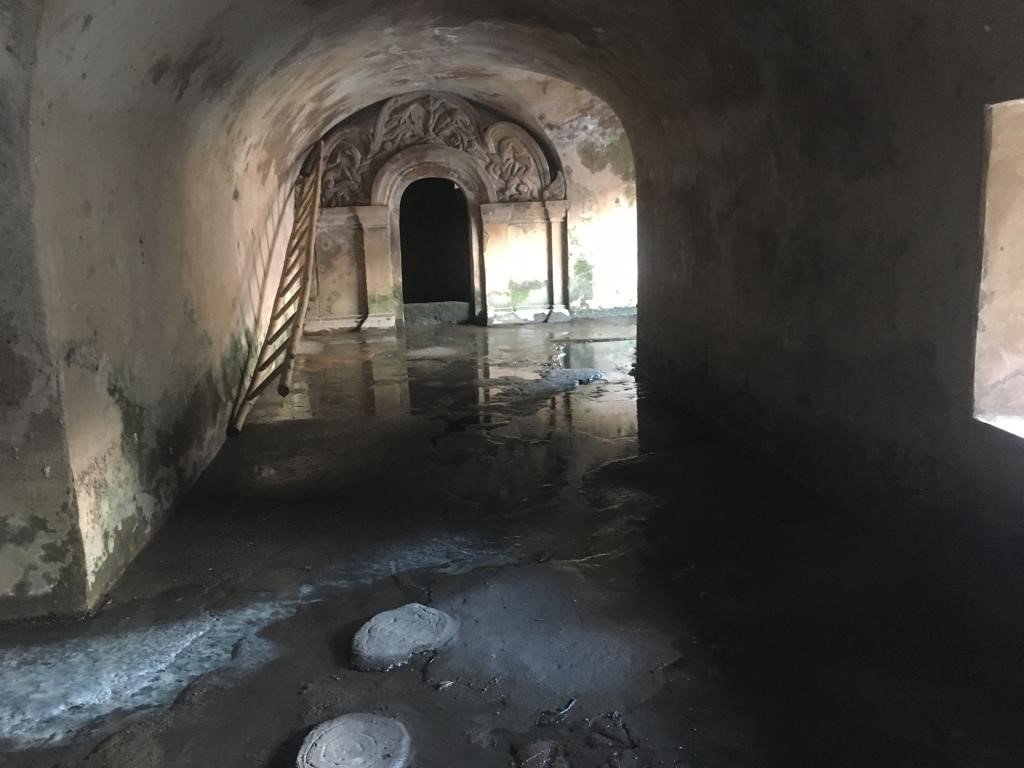 Kami kemudian berjalan menuju bangunan utama dan mengintip bagian bawah bangunan. Terlihat sebuah lorong dengan atap model melengkung dan sebuah pintu di ujungnya. Pintu ini pun bentuknya melengkung di bagian atas dan memiliki hiasan berupa ukiran motif bunga- bungaan. Ada jendela kecil segi empat di sebelah kanan dan juga belokan ke kanan yang memberikan akses cahaya. Namun karena lantainya lebih rendah dan dalam kondisi becek dipenuhi air serta aroma lembab yang menimbulkan bau kurang sedap kami urungkan niat menjelajah bagian bawah bangunan ini.