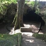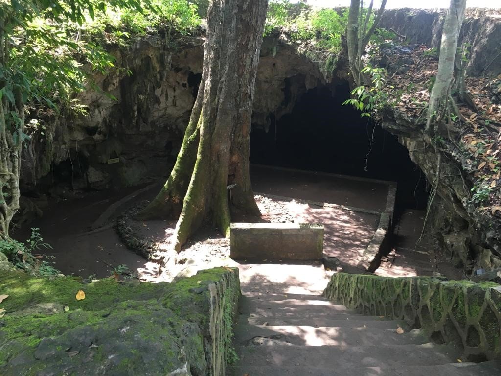 Sesampainya di mulut gua, ada sebuah pohon besar yang tinggi dan terkesan sakral menyambut kami. Untuk turun ke pelataran di gua, ada anak tangga dari batu dengan ketinggian sekitar dua setengah atau tiga meter. Di dekat pohon ada sebuah tembok kecil yang mungkin bisa digunakan untuk tempat duduk.
