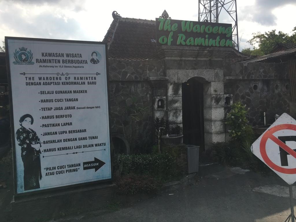 Di depan Waroung Raminten ini, kembali ada gambar Raminten berkebaya dan berkonde besar dengan pesan-pesan yang menarik buat pelanggan. Kawasan Wisata Raminten Berbudaya, demikian warung ini menjuluki warung ini dan menghimbau pengunjung untuk menggunakan masker, mencuci tangan, menjaga jarak selain harus berfoto, lapar, bersabar, membayar dengan uang tunai dan juga harus kembali lagi.