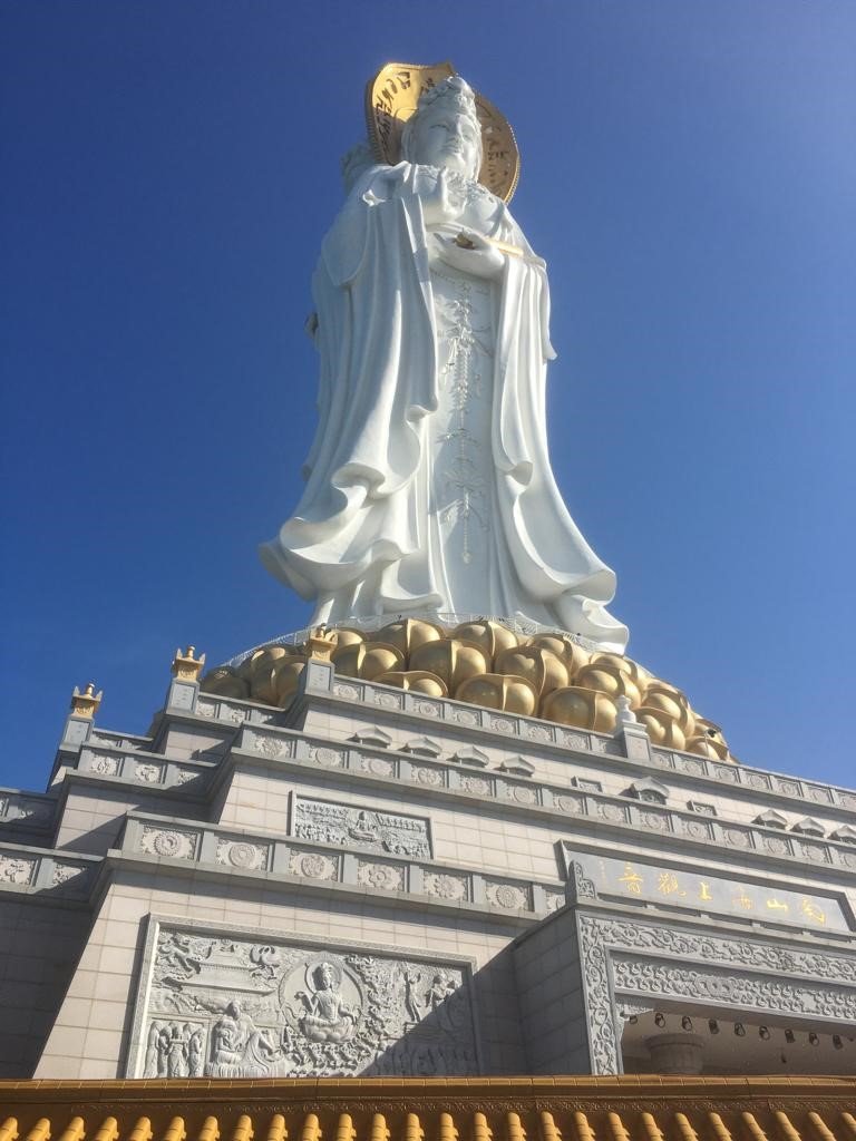 Dari bawah sini, tampak jika patung sang Dewi yang tingginya mencapai 108 meter ini menjulang tinggi. Konon ketika selesai dibangun patung ini sempat menjadi yang tertinggi di dunia dan juga lebih tinggi dari Patung Dewi Kemerdekaan atau Liberty yang ada di kota New York. Patung ini ternyata memiliki tiga wajah, satu wajah menghadap ke pulau Hainan dan dua wajah lainnya menghadap ke laut Tiongkok Selatan. Masing-masing tangan pada setiap sisi patung memegang bunga teratai, kitab dan juga tasbih. Konon ini melambangkan kebijaksanaan, kedamaian dan welas asih.