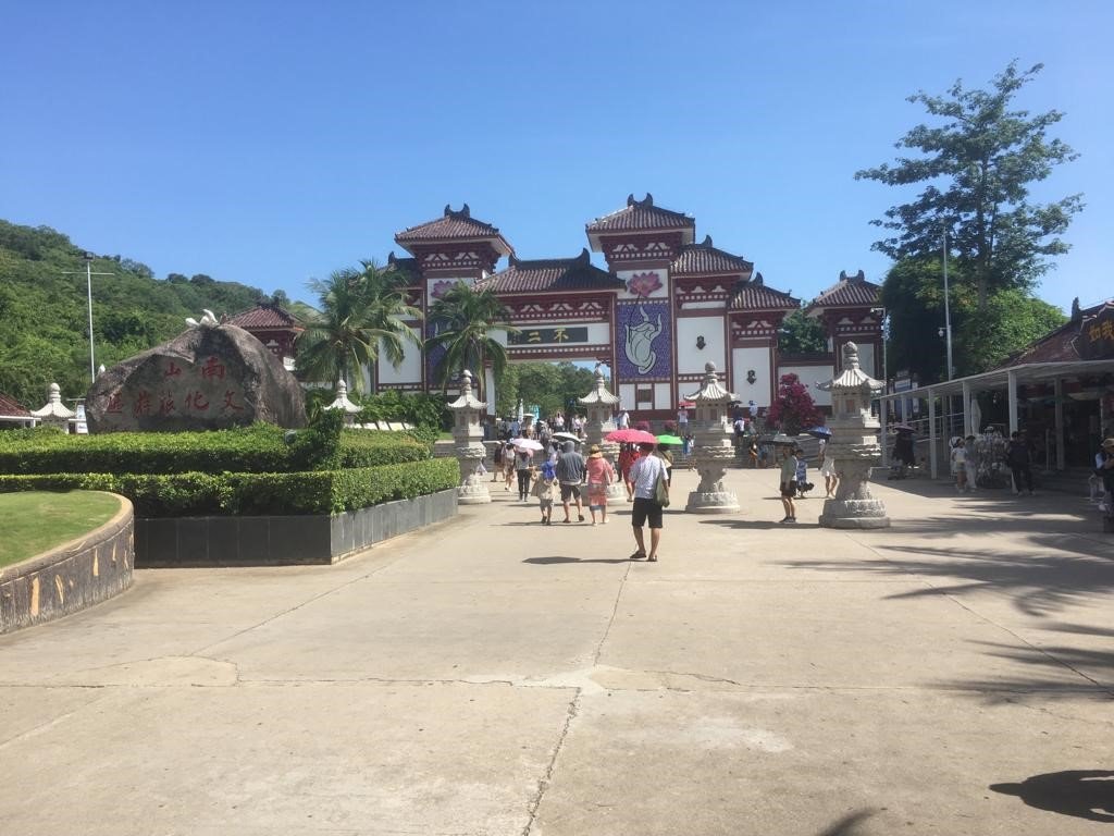 Matahari pulau Hainan yang garang menyengat langsung membakar kulit ketika kami keluar dari bus di Sanya Nanshan Cultural Tourism Zone. Siang itu suasana lumayan ramai dengan berjejernya puluhan bus wisata dan sebagian besar pengunjung mulai mengembangkan payung di atas kepala walau sama sekali tidak ada hujan. Dengan suhu udara sekitar 36 derajat, panas terasa membakar, namun sama sekali tidak menghasilkan keringat karena kelembaban yang rendah.