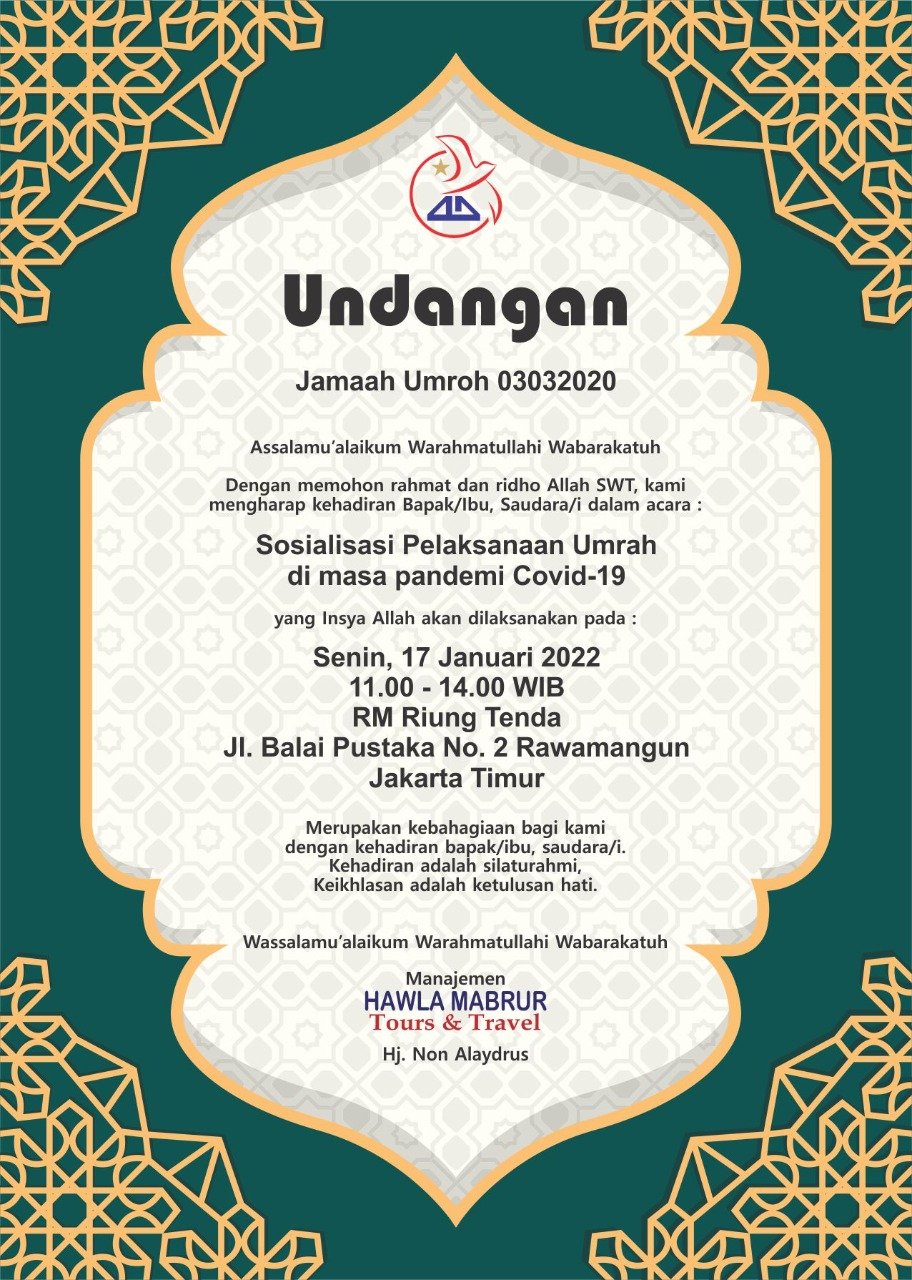 InshaAllah Jamaah Umroh Hawla Mabrur Tour & Travel berangkat menunaikan Ibadah Umroh Bulan Maret 2022.  Demikianlah doa dan harapan berupa kesepakatan sementara jamaah ketika bersilaturahmi pada hari Senin 17 Januari 2022. Hampir 2 tahun keberangkatan tertunda bersebab pandemi covid 19.