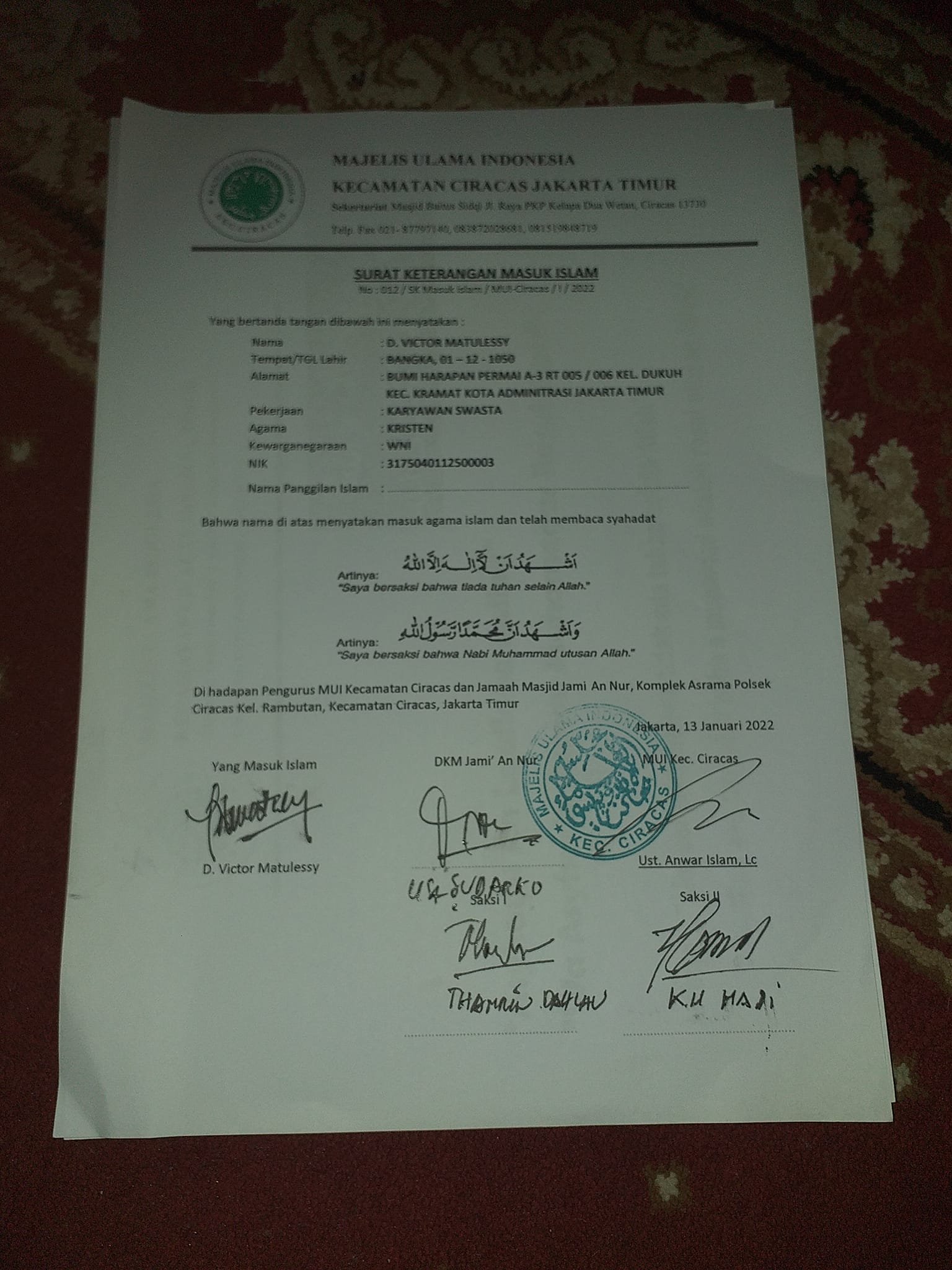 Alhamdulillah Ustazd KH Anwar Islam, Lc  Ketua Majelis Ulama Indonesia (MUI)  Kecamatan Cicaras memimpin (ulang) syahadat. Piagam langsung diterima Pak Victor sebagai kelengkapan dokumen  persyaratan mengurus mutasi status kependudukan di Kelurahan Dukuh Jakarta Timur.