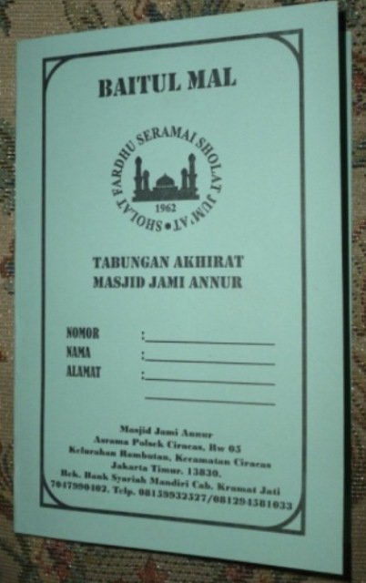 Buku Tabungan Akherat ini merupakan salah satu dari 17 pr0gram Masjid Jami An Nur.Masjid yang berlokasi di Jalan Raya Bogor Km 21 RW 05 Kelurahan Rambutan Jakarta Timur telah lama mendawamkan Program Zakat.Jamaah diberikan Buku Tabungan Akherat mendampingi buku buku tabungan lainnya dari bank sebagai penyeimbang kehidupan dunia dan akherat.