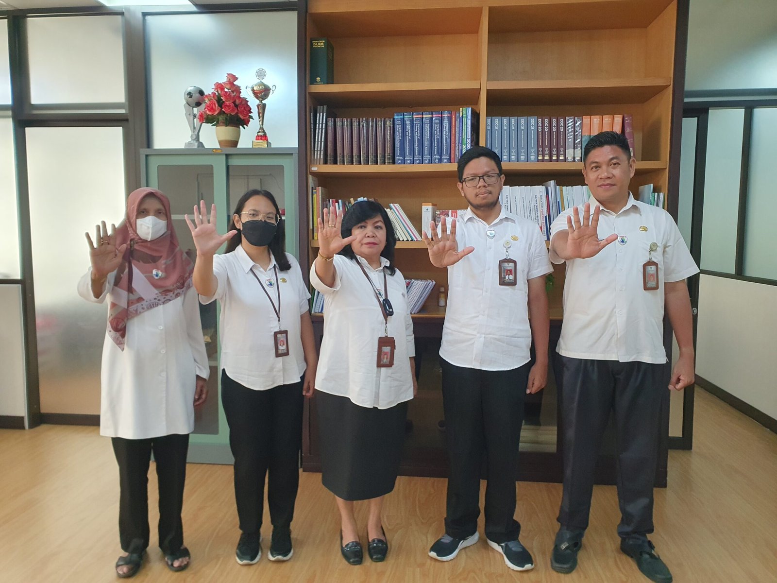- Tangan Berwarna Hijau dan Biru : melambangkan identitas instansi yang berkomitmen dalam mencegah tindak gratifikasi serta kedalaman ilmu pengetahuan yang dimiliki sebagai landasan dalam pengabdian kepada masyarakat, nusa dan bangsa.