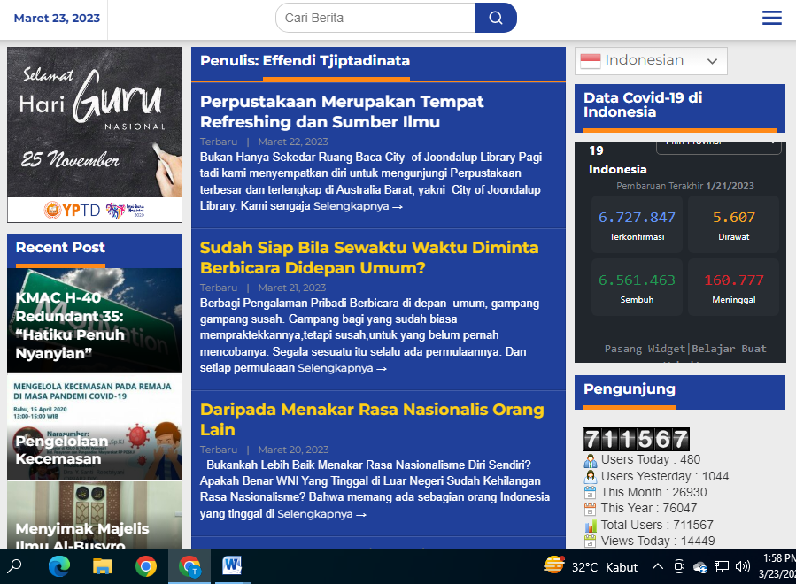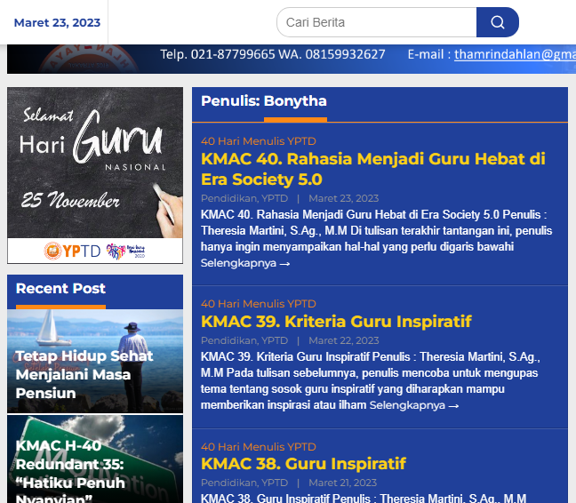 Caranya kita sudah paham semua. Ketik nama anda dan pengarang (misal Bonytha Pengarang) di mesin pencarian google.com. Disana sudah tertera semua posting KMAC di website YPTD terbitin.id seeprti terlihat di dokumentasi foro ini