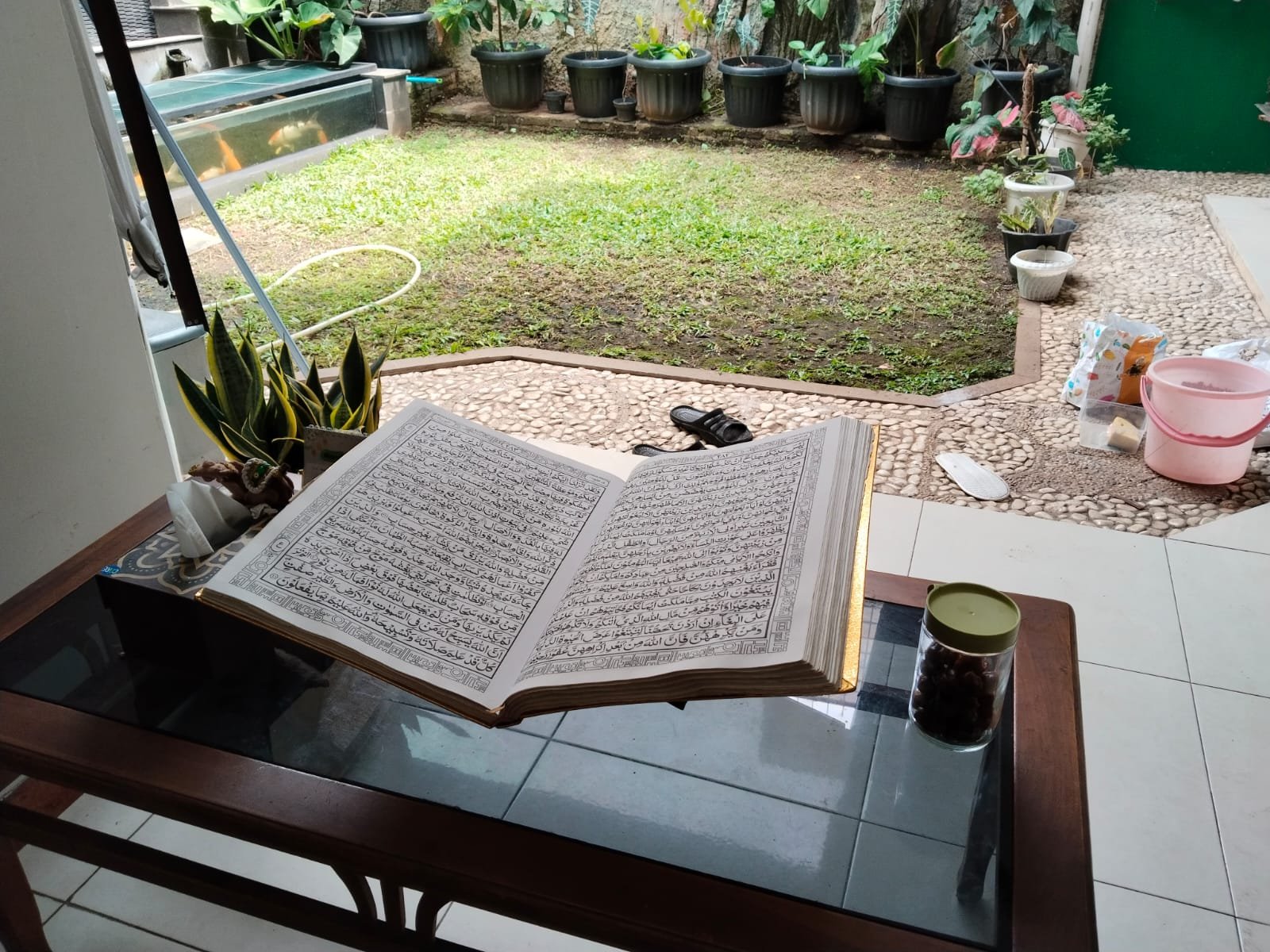 Alhamdulillah terdengarlah Murotal Imam Masjidil Haram Sheik Sudais. Bacaan cukup cepat. Menyimak dan mendengar sembari mengikuti bacaan di Kitab.