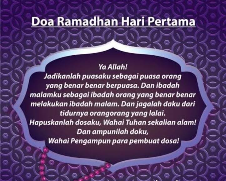 Ya Allah, jadikan puasaku di bulan ini sebagai puasa orang-orang yang berpuasa sebenarnya, shalat malamku di dalamnya sebagai orang yang shalat malam sebenarnya, bangunkan daku di dalamnya dari tidurnya orang-orang yang lalai. Bebaskan aku dari dosa-dosaku wahai Tuhan semesta alam. Maafkan aku wahai Yang Memberi ampunan kepada orang-orang yang berbuat dosa.