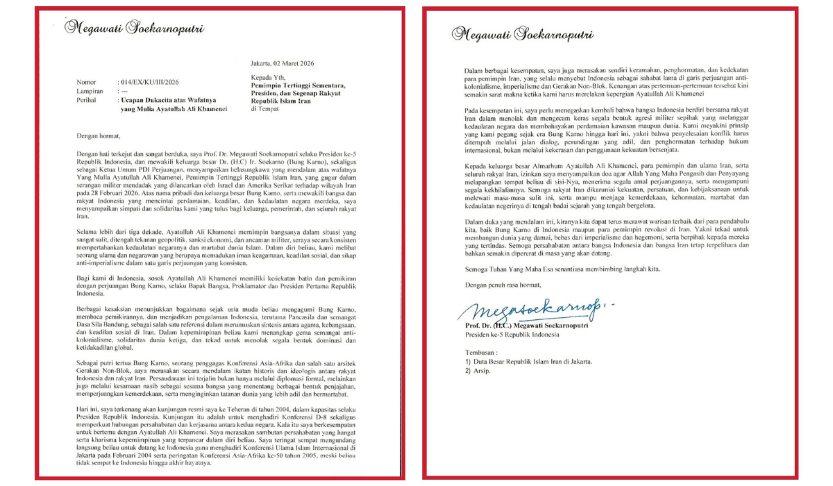 Dalam suratnya, Megawati menyatakan rasa terkejut dan duka mendalam atas wafatnya Ayatollah Ali Khamenei. Ia menyampaikan belasungkawa atas nama pribadi, keluarga besar Bung Karno, serta sebagai Ketua Umum PDI Perjuangan.