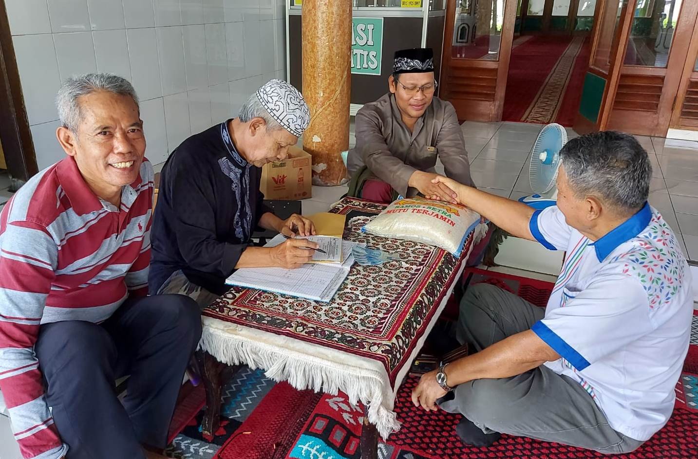Ustazd Fadil Bastaman Imam Rawatib Masjid menerima secara syariah akad zakat. Dibacakan doa dan diaminkan. Petugas mencatat dan memberikan tanda terima disaksikan para jamaah dan ibu ibu.