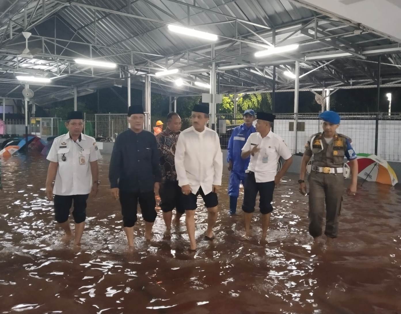 Walikota Jakarta Timur M. Anwar, SSi, MAP di dampingi Camat Kramatjati dan Ketua RW 06 melewati genangan air menuju Masjid Baitur Rahman BHP