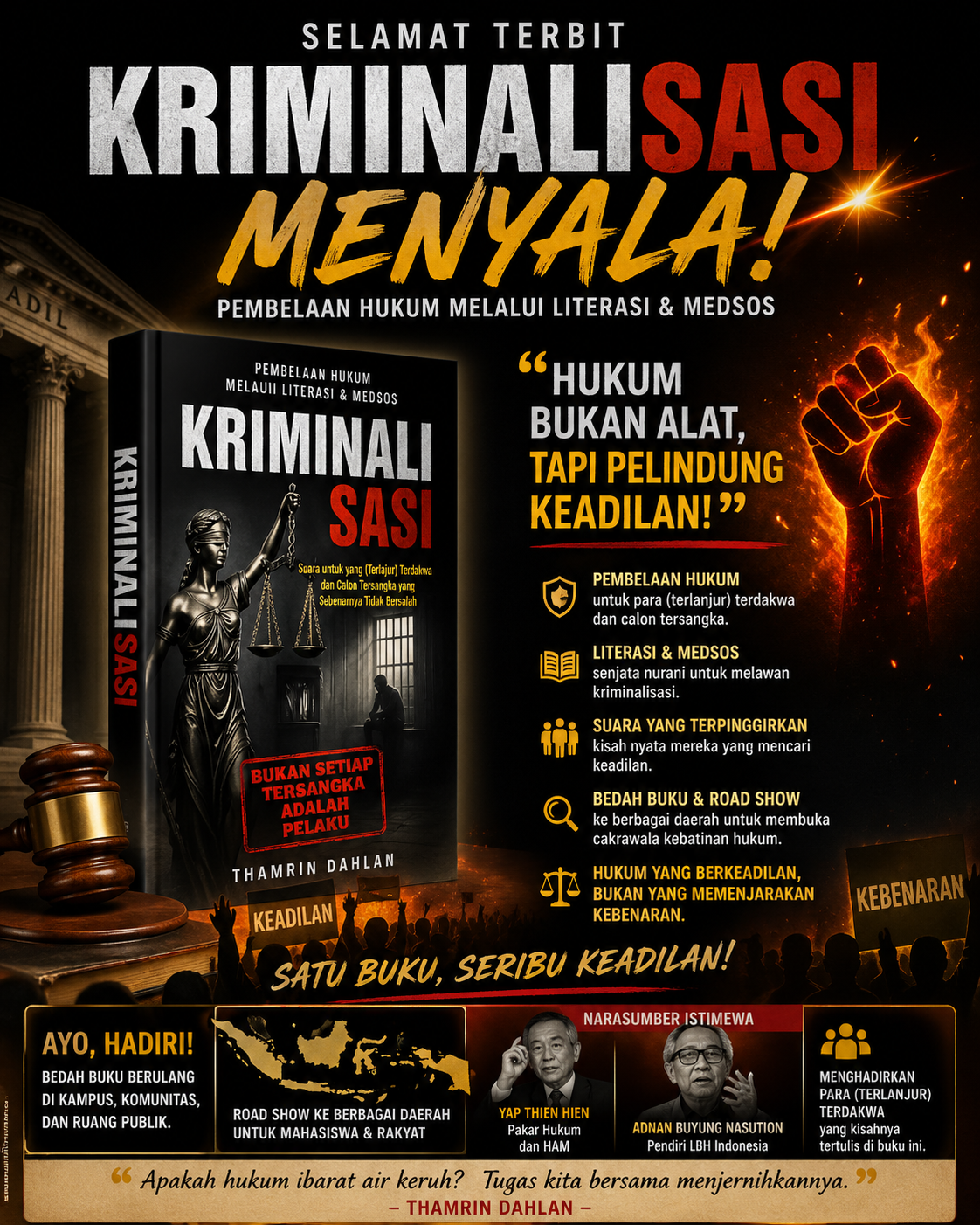 Menghadirkan narasumber dari kalangan terdakwa yang kisahnya tertulis dalam buku akan memperkaya perspektif empiris. Dipadukan dengan pandangan para pakar hukum seperti Yap Thien Hien dan Adnan Buyung Nasution, diskursus akan menjadi lebih hidup dan berimbang antara teori dan praktik. Ini penting agar hukum tidak hanya menjadi norma abstrak, tetapi juga refleksi nyata dari keadilan substantif.