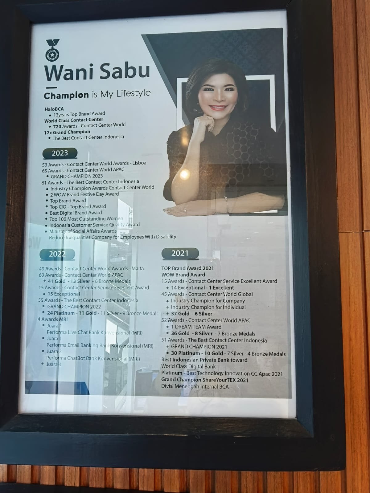 Profil Wani Sabu yang terpajang di dinding pusat Halo BCA.–