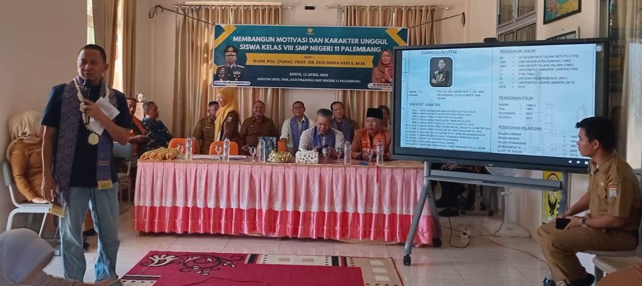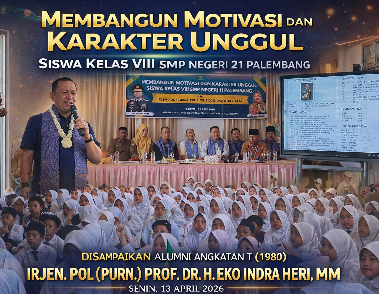Kegiatan pembinaan karakter dan motivasi bagi siswa kelas VIII SMP Negeri 21 Palembang berlangsung dengan penuh semangat dan antusias. Acara ini menghadirkan narasumber inspiratif, Irjen Pol (Purn.) Prof. Dr. H. Eko Indra Heri, M.M, Alumni Angkatan 1 (1980), yang memberikan motivasi tentang pentingnya disiplin, integritas, serta semangat belajar dalam meraih masa depan.
