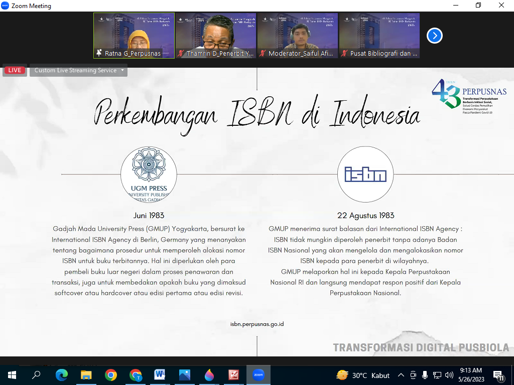 43 Tahun Perpusnas Mengabdi 37 Tahun ISBN Berkiprah merupakan topik webinar. Berdasarkan Fakta sejarah Pelayanan ISBN Indonesia mulai tahun 1