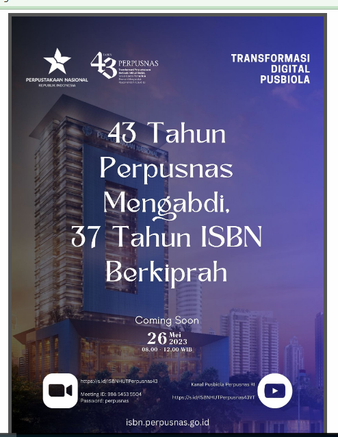 Perpustakaan Nasional menyelenggarakan Webinar Transformasi Digital Pelayanan International Standard Book Number (ISBN). Acara dilaksanakan Online Jum’at 26 Mei 2023 By Zoom Pukul 08.30 – 11.30 Wib.