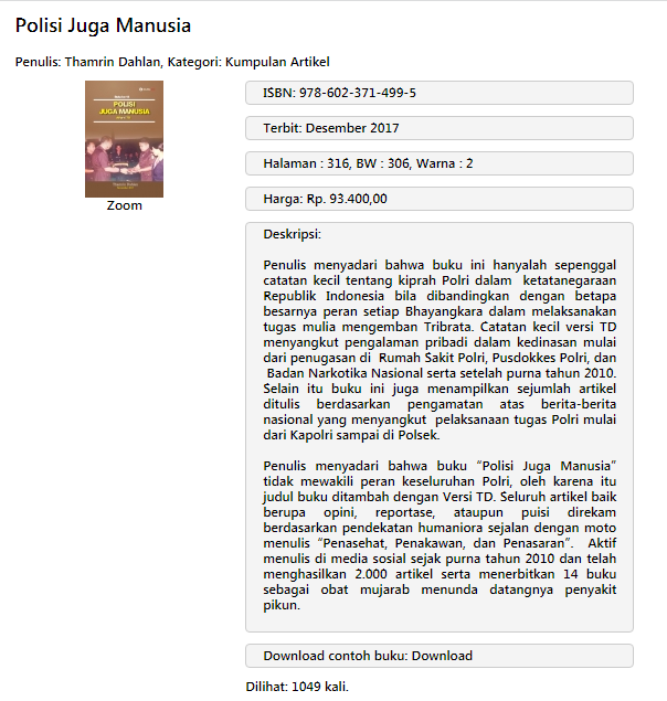 Buku Polisi Juga Manusia terdaftar di Perpustakaan Nasional dengan Barcode ISBN: 978-602-371-499-5. Terbit: Desember 2017 Halaman : 316, BW : 306, Warna : 2
