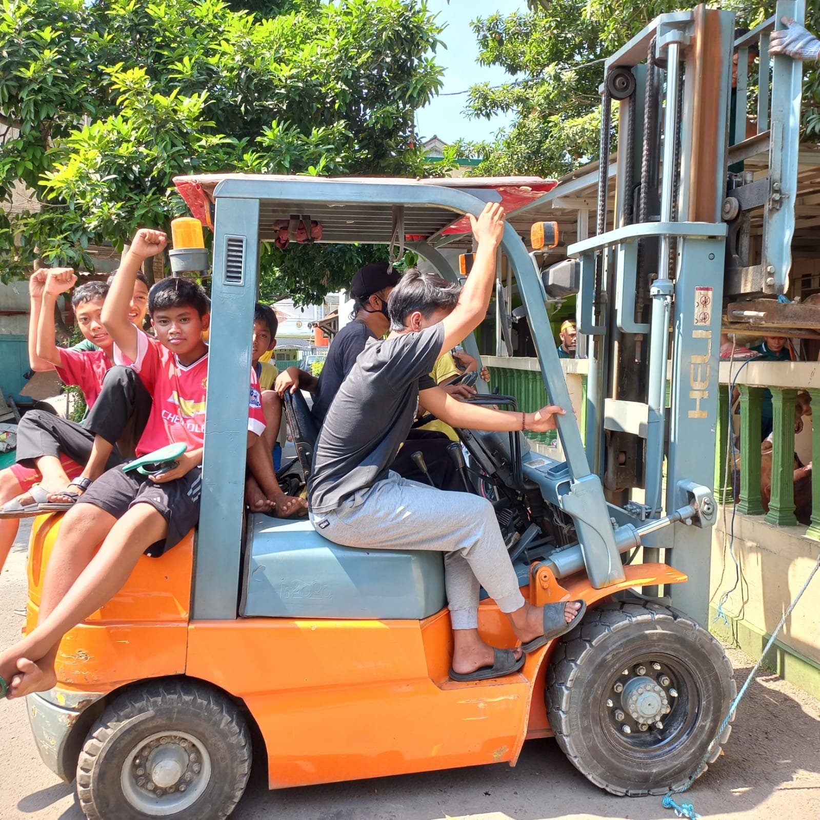 Prosesi penyembelihan hewan qurban disaksikan puluhan warga. Mereka berdesak desakan menilah Panitia bekerja sementara anak anak kolong justru lain lagi lagaknya, Mereka menaiki fork lift yang mengankuta Sapi sebari tertawa tewa. Inilah salah satu keunikan dan dinamika Idhul Adha