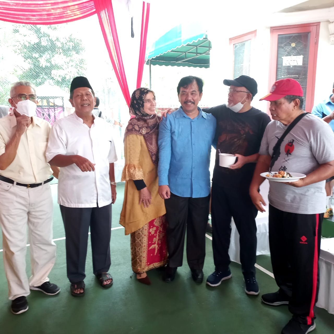 Ternyata acara tidak resmi resmi banget. Justru suasana silaturahim lebih kental. Tampak tetamu mulai ramai berdatangan, berpakaian rapi, berbatik dan Ibu ibu berhijab warna warni. Spesial senior tennis BHP Bapak Haji Muhajir (80 Tahun) malah tampil style bak anak muda.