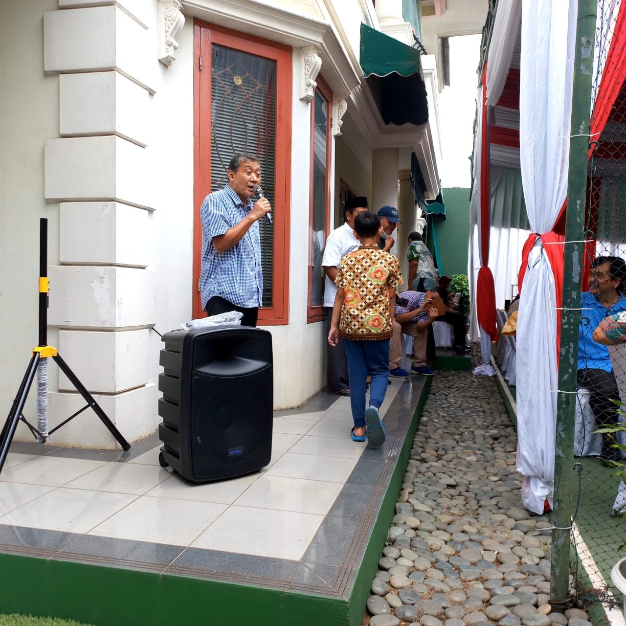 Sekeliling pagar di pasang bendera merah putih, Ada tenda nuansa kemerdekaan. Sudah ada beberapa tamu. Pof Zul dan Putra Dr Lukman menyambut kedatangan tetamu dengan senyum renyah. Sahabat tennis seperti biasa duduk berkelompok. Keringat sudah di lap bersih, kelelahan bermain tampak dari sorot mata.