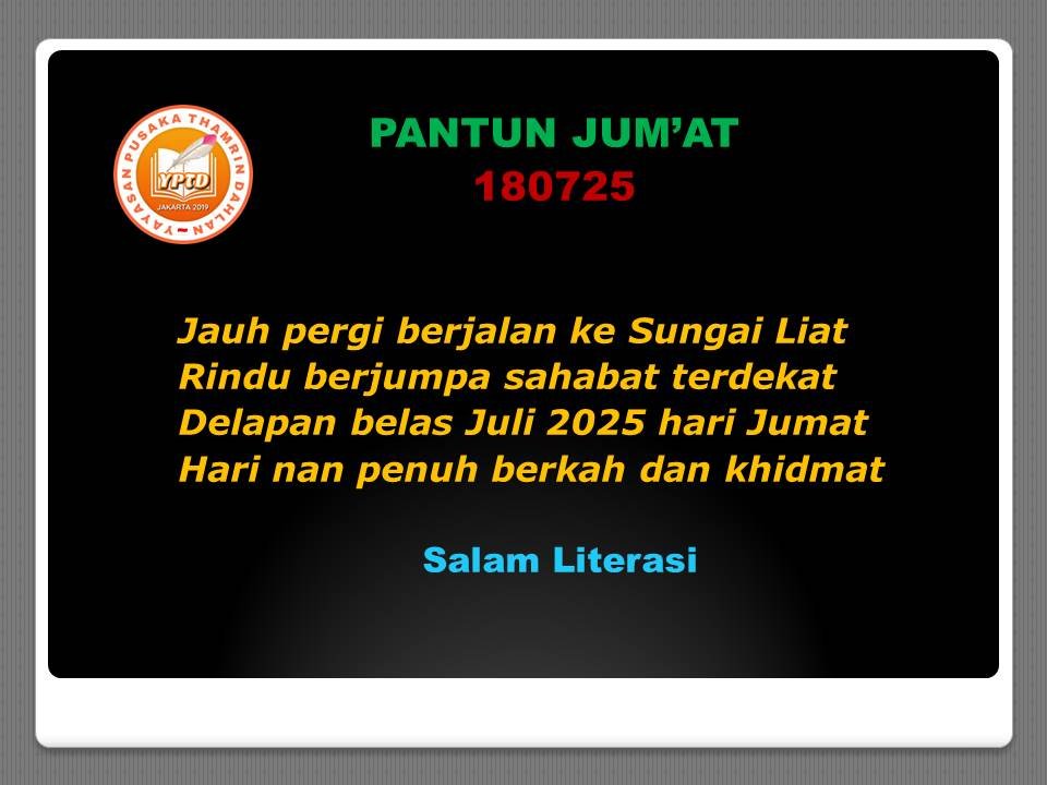 Jum’at BarkahThamrin DahlanJuli 18, 2025Juli 18, 2025Islam, Pantun, Terbaru, YPTD343 Dilihat Hari Jum’at Spesial Bapakku H. Raden Dahlan Bin Affan Jangan LewatkanForum Kelurahan Dukuh8 Tahun Tanpa Jeda Dahlan Iskan Menulis 2.922 Artikel.Penonaktifan ribuan peserta BPJS PBI: Antara Validasi Data dan Hak Dasar Kesehatan WargaLatar Belakang Foto Menara EiffelBulan Bulat di Madinah