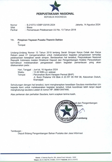 Berdasarkan Surat Perpustakaan Nasional Nomor B.2107/3.1/DBP.03/VIII/2024 tanggal 14 Agustus 202 tentang Pemantauan Pelaksanaan UU No. 13 Tahun 2018, Penerbit Yayaysan Pusaka Thamrin Dahlan (YPTD) segera mengirim Surat Balasan sebagai bentuk rasa terima kasih dan siap menerima kunjungan Tim Perpusnas.