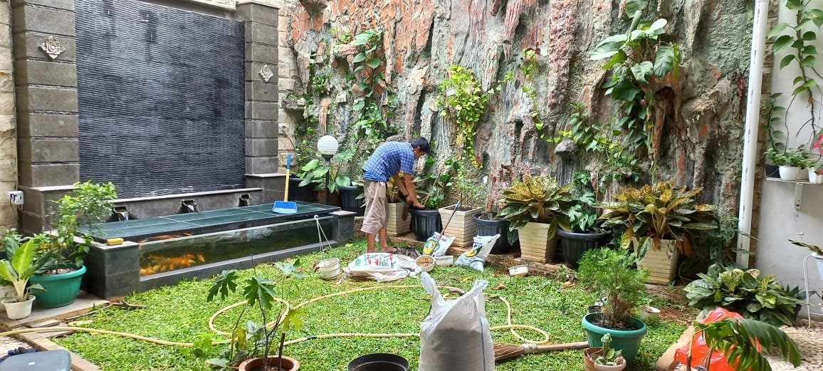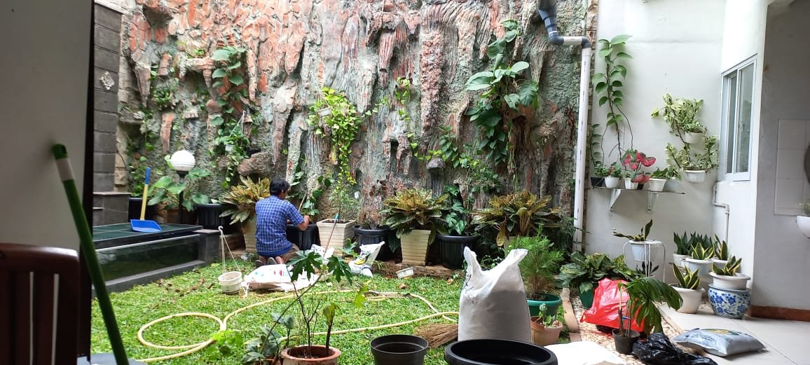 Hari ini si tangan dingin merawat taman di Jalan Bumi Pratama VIII Blok A 23. Minggu lalu sudah menata halaman taman di depan rumah. Antara lain menanam rumput hijau menghijau . Kini halaman kebon kecil di belakang rumah perlu ditata lagi.