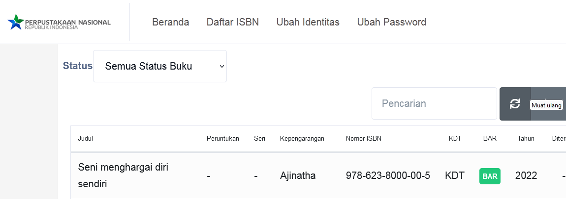 Buku Bang Ajinatha berjudul *Seni Menghargai Diri* dengan Barcode ISBN : 978-623-8000-00-5 di validasi Perpusnas Senin 17 Oktober 2022.