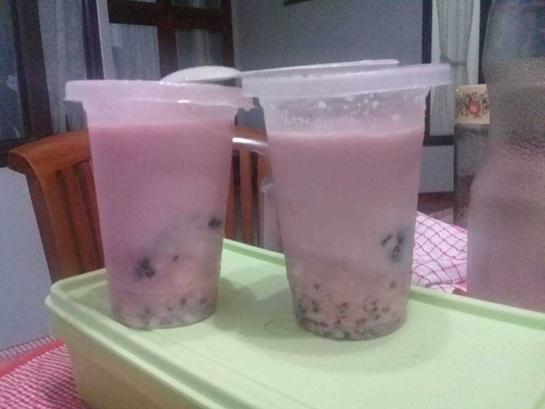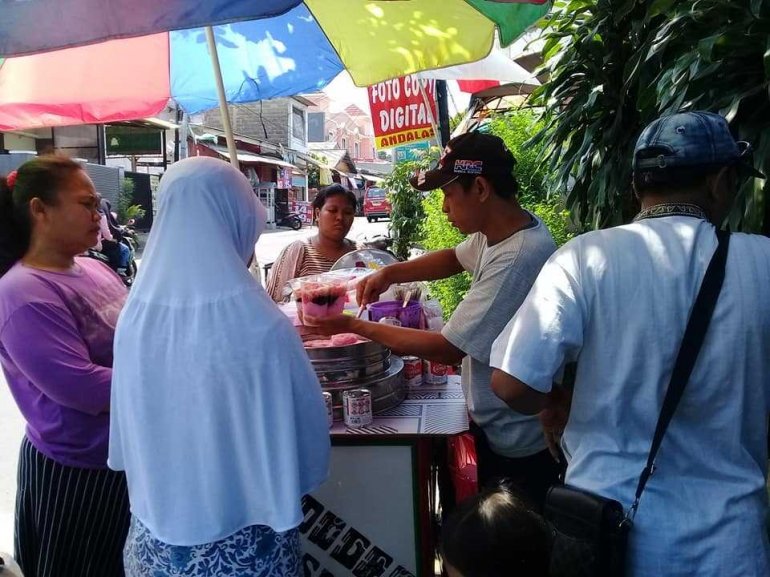 Hari itu istri awak membeli 6 gelas. Setelah cukup sabar menunggu antrian.  Semua belanjaan dibungkus untuk dibawa pulang. Si abang tidak menyediakan bangku tempat duduk maklum jualan di kaki lima pinggir jalan raya. Pinjam tempat sementara untuk memarkir motor sekaligus berfungsi sebagai  tempat jualan. Terpaksa  beratap payung peneduh guna menahan panas terik matahari.