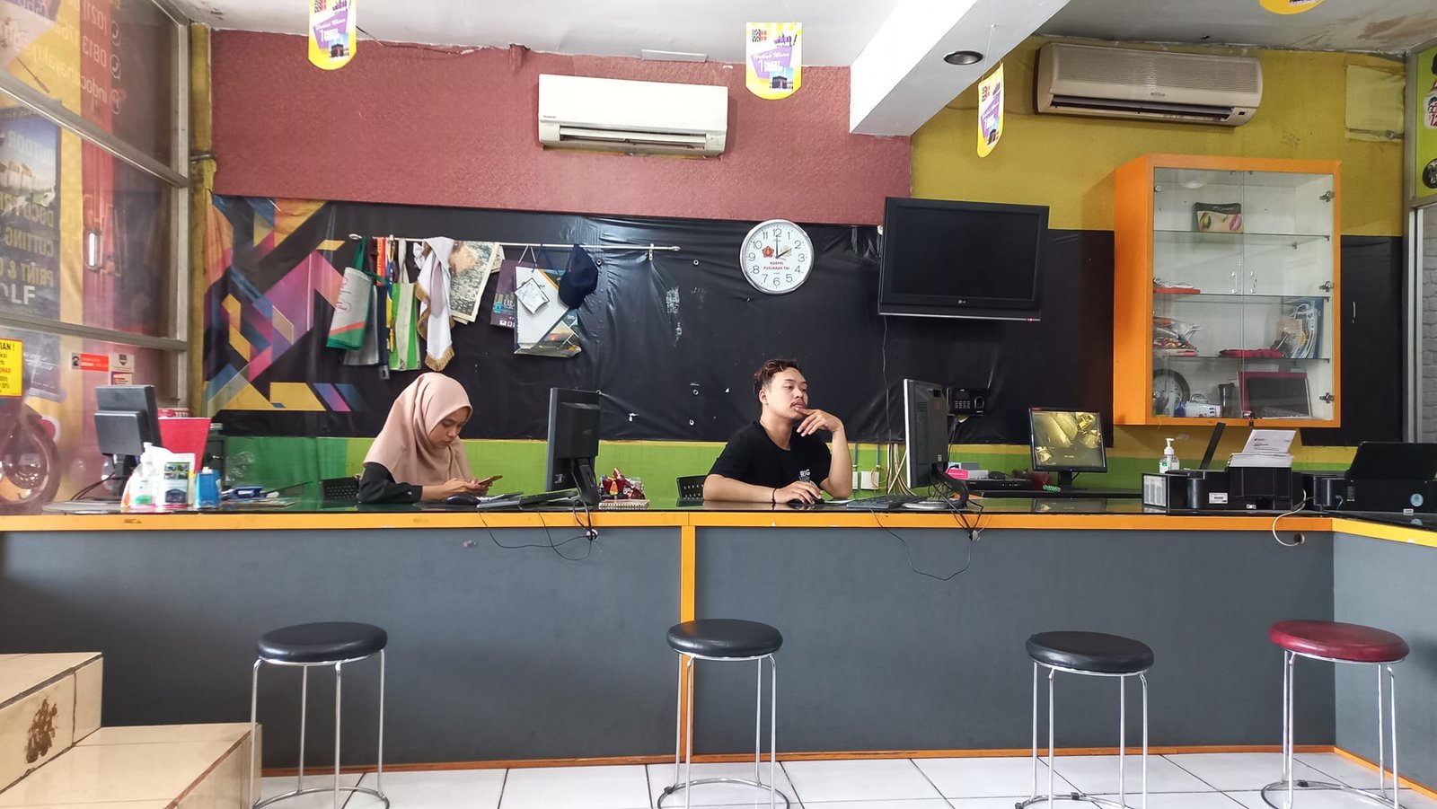Menyerahkan desain spanduk via Hand Phone ke Mbak ber hijab. Ramah sekali. Menawarkan apakah tulisan spanduk mau di beri warna. Tentu saja awak senang mendapatkan pelayanan super ini.