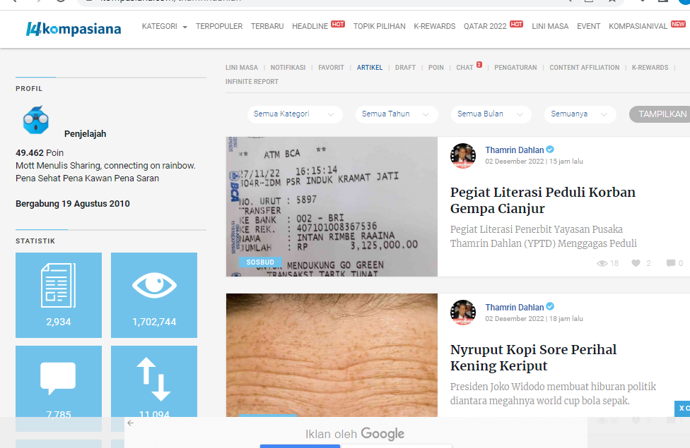 Catatan terakhir di profil penulis : 2024 artikel dan sejumlah view. Lumayan banyak posting di kompasiana. Fakta awak dari hasil belajar disini telah menerbitkan 50 Judul Buku. Kemudian melalui Penerbit Yayasan Pusaka Thamrin Dahlan (YPTD) : 357 Judul Buku ber ISBN. Diantaranya Buku buku sahabat kompasianer.