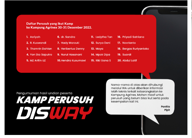 Berita Gembira. Alhamdulillah awak terpilih menjadi Peserta Kamp Perusuh Disway. Disway.id adalah portal berita media sosial non hoaks Bapak Dahlan Iskan (DI). Menjadi bagian disway setiap hari membaca dan menyapaikan tanggapan di kolom komentar.