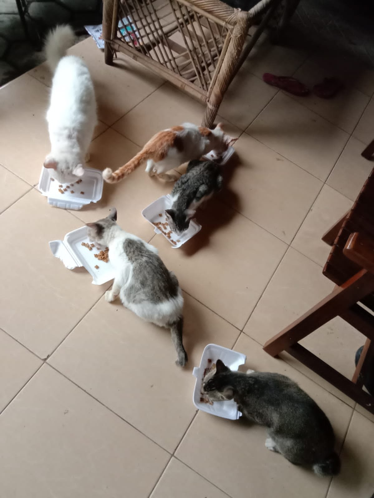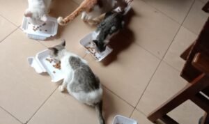 Mereka sangat senang diberi makan. Setiap hari mereka bermain di teras rumah. Istri menyiapkan tempat untuk mereka buang aor besar. Kotoran kucing tidak bertebaran di sembarang tempat.